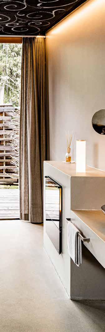Mietbadezimmer mit ausreichend Platz und angenehmer Atmosphäre mit Effektfeuer und Whirlpool. Das Bad Sextner Sonnenuhr ist ausschließlich in Kombination mit einem De Luxe Stellplatz buchbar und im Preis sind während Ihres ganzen Aufenthalts der Zutritt zum Poolbereich und zur Saunawelt sowie eine WellnessTasche inbegriffen.
