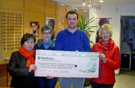 Benefizaktion von Optik Brugger Das eigene Leid zum Anlass nehmen, anderen zu helfen. Ein schönes Beispiel wie man Trauer bewältigen und seinen Lieben ehren kann, war eine BenefizInitiative von Optik Brugger in Brixen im Gedenken an den im vergangenen Jahr an Krebs verstorbenen ehemaligen Geschäftsinhaber. Im Bild die Übergabe des Schecks von 1.300 Euro an die Präsidentin Renate Daporta Jöchler.