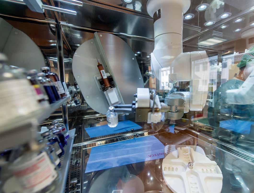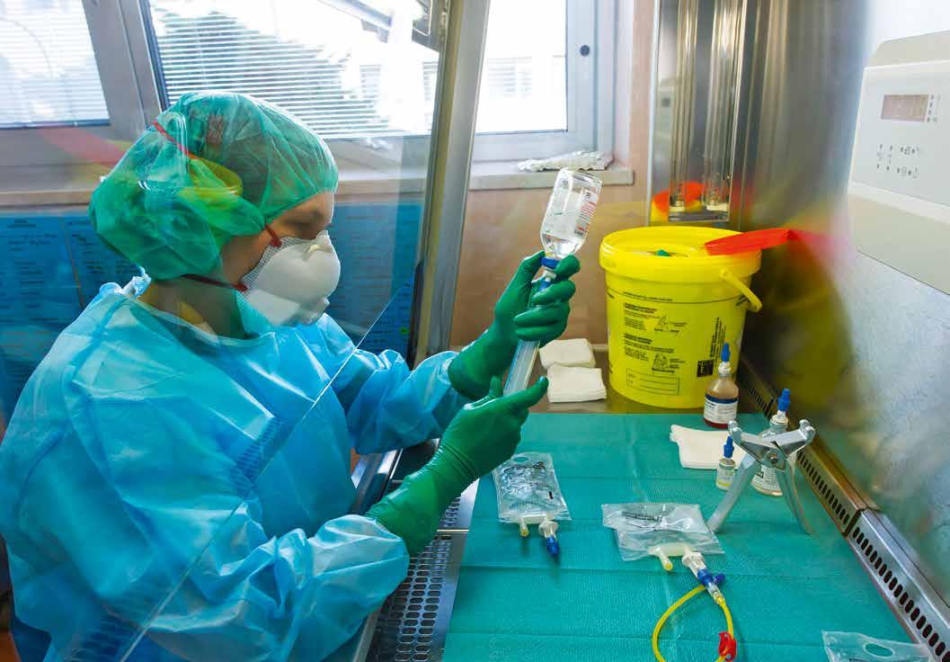 Im Zytostatika-Labor arbeiten vier Techniker und zwei Apotheker, Dr. Verena Niederwanger und Dr. Martin Großgasteiger. Die Infusionsbeutel mit den Chemotherapien werden im Isolator von den Technikern zubereitet, eingeschweißt und ausgeschleust und dann in einem sterilen Tragebehälter in den ChemotherapieRaum gebracht.