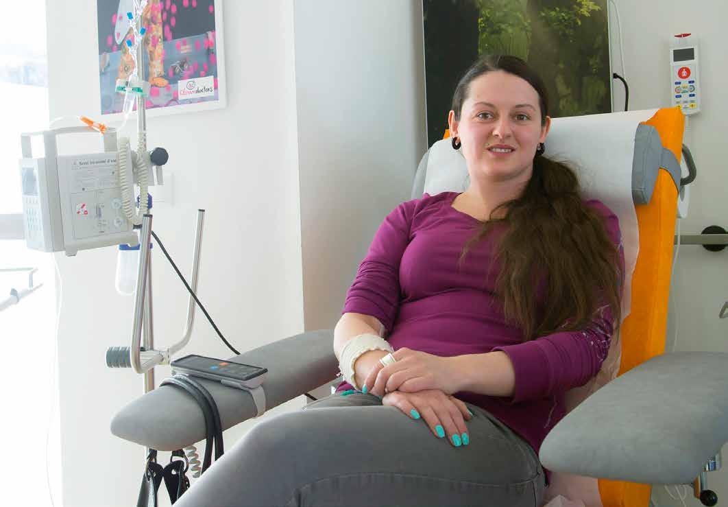 Heute hat sie Kopfschmerzen. Die Blutwerte sind aber in Ordnung und Dr. Ulrike Felder hat schon mit ihr gesprochen und sie beruhigt. Sie kann die Chemotherapie machen. Sonja Obkircher ist 28 Jahre alt und ist am 3. Zyklus angelangt.