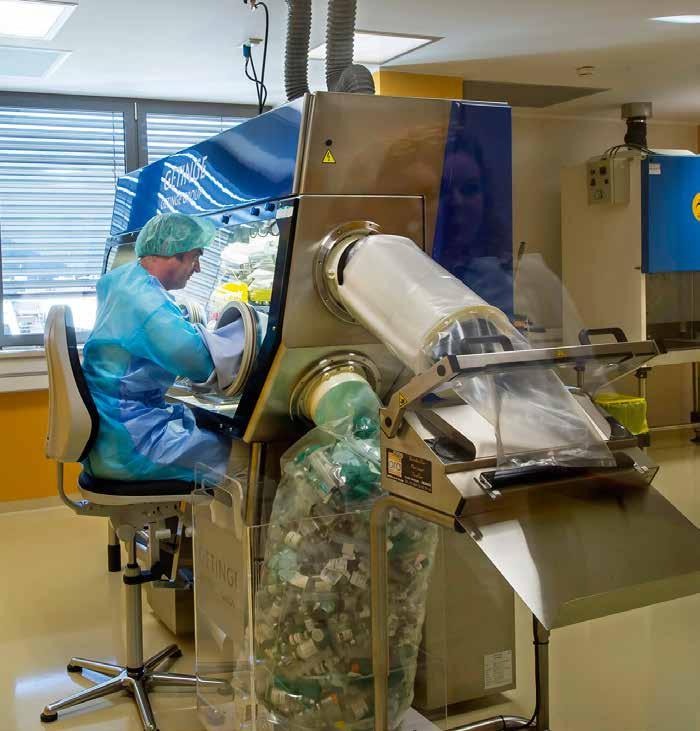 geschützt. Die Zubereitung im sterilen Isolator hat den Vorteil, dass die Medikamentenfläschchen aufgebracht werden können und nicht nach einmaliger Entnahme entsorgt werden müssen. Bei einem Preis von bis zu 2.000 €uro pro Medizin ist mit der Arbeit am Isolator eine große Kostenersparnis verbunden.