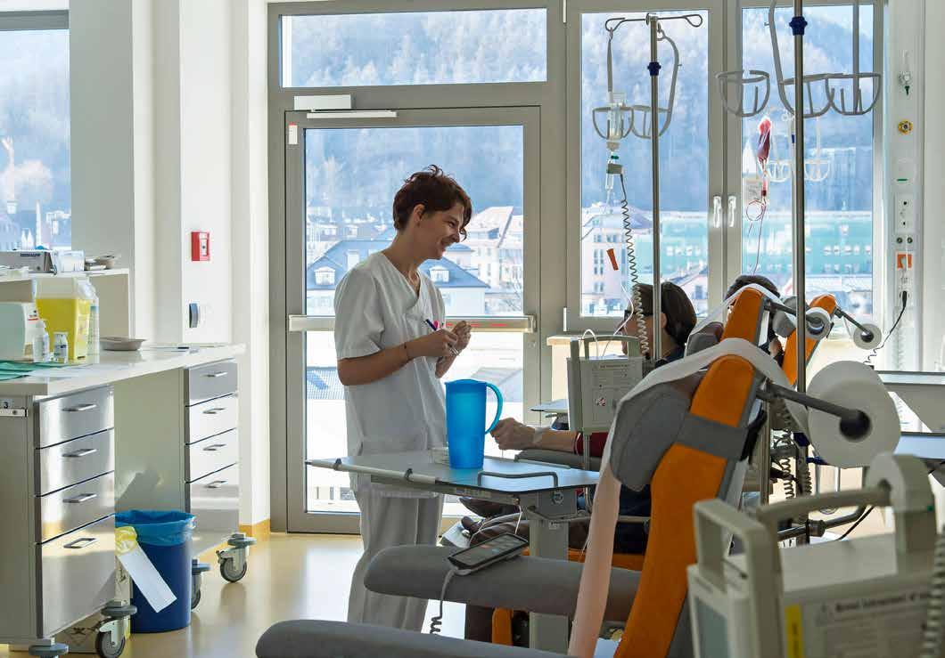 Zum Greifen nah scheinen sie, der Kronplatz und das Brunecker Schloss. Der große lichtdurchflutete Saal der onkologischen Tagesklinik in Bruneck kann bis zu zehn Patienten aufnehmen. Seit 2. November erhalten die onkologischen Patienten aller Abteilungen des Krankenhauses hier ihre Chemotherapie.