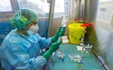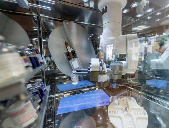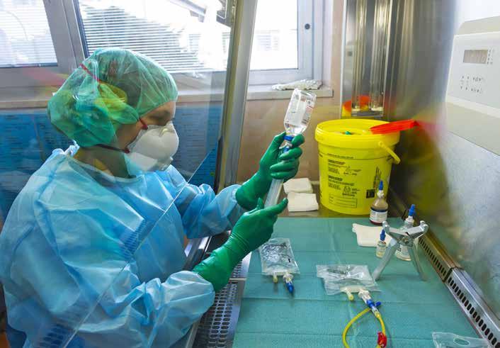 Nel laboratorio prestano servizio quattro tecnici di laboratorio che preparano le chemioterapia all’Isolatore in assoluta sterilità. Le sacche vengono incelofanate ed escono da una camera di compensazione per essere portate alla postazione dei pazienti.