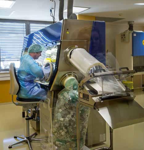 Il tecnico Ulrich Messner sta preparando delle infusioni di chemioterapia all'isolatore. I flaconcini usati escono direttamente in un sacco sterile