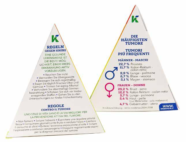 L’Assistenza Tumori Alto Adige ha avuto un’idea originale per informare la popolazione in modo sintetico ed efficace sul tema cancro e sulla sua prevenzione. Una piramide molto pratica da usare: sui suoi tre lati si trovano riassunte le informazioni più importanti riguardo al tema cancro e alle pratiche di prevenzione. “La piramide riporta le cifre più importanti riguardo l’incidenza del cancro in Alto Adige, le dieci regole del codice europeo del cancro e anche una piramide nutrizionale che mostra immediatamente a cosa bisogna prestare attenzione nell’alimentazione”, spiega Ida Schacher. Una pagina di cifre, una con la piramide alimentare e una con le regole del