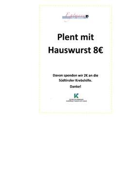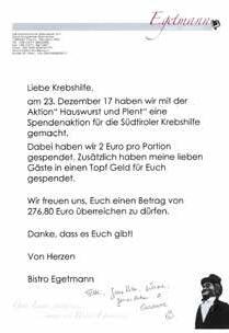 I proprietari del BistrotEgetmann di Termeno poco prima di Natale hanno organizzato una giornata “Plent mit Hauswurst” donando una parte del ricavato all’Assistenza Tumori. Ringraziamo Silke, Werner, Jana Rita, Jonas Artur e Susanne.
