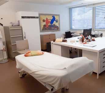 Auch die Warteräume der Patienten bezeugen das besondere Augenmerk auf Atmosphäre. Die Behandlung mit Radiopharmaka bringt eine längere Verweildauer mit sich, deshalb sind die beiden getrennten Warteräume (für Tagespatienten und für Patienten, die zwei Tage isoliert auf der Abteilung verbleiben) entsprechend eingerichtet: mit Pflanzen und gut gefüllten Bücherregalen, die Abteilung ist an mehrere Zeitschriften und Zeitungen abonniert und immer wieder werden die Räume für Fotoausstellungen genutzt. •