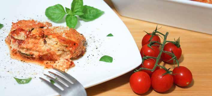 4. Eine rechteckige Auflaufform mit Öl einpinseln. Ungefähr ein Drittel der Tomatensoße in der Auflaufform verteilen, darüber eine Schicht Zucchini legen und mit Mandelricotta bedecken. Vorgang wiederholen, bis die Auflaufform voll ist.