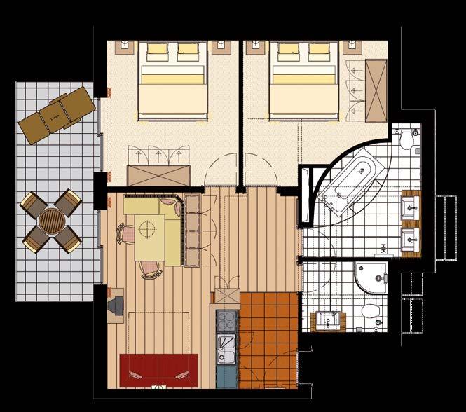 Soggiorno (con divano letto) e due camere da letto separate, due bagni + posto auto nel garage.