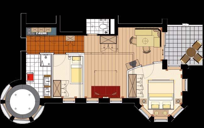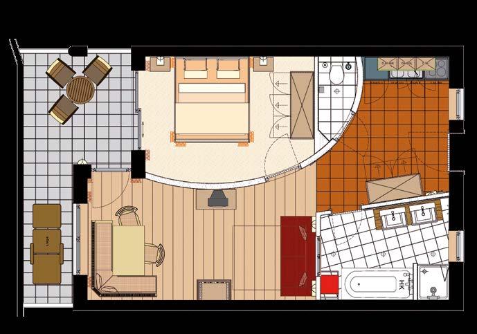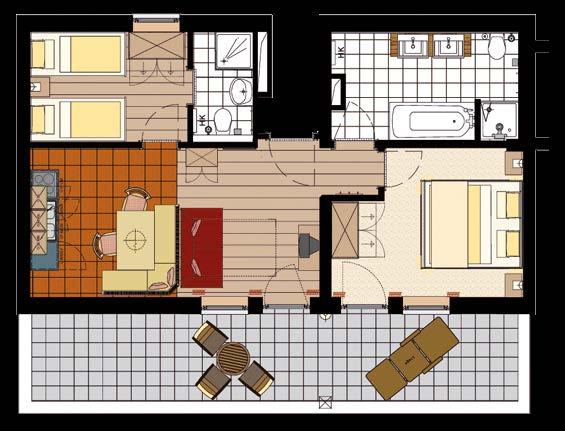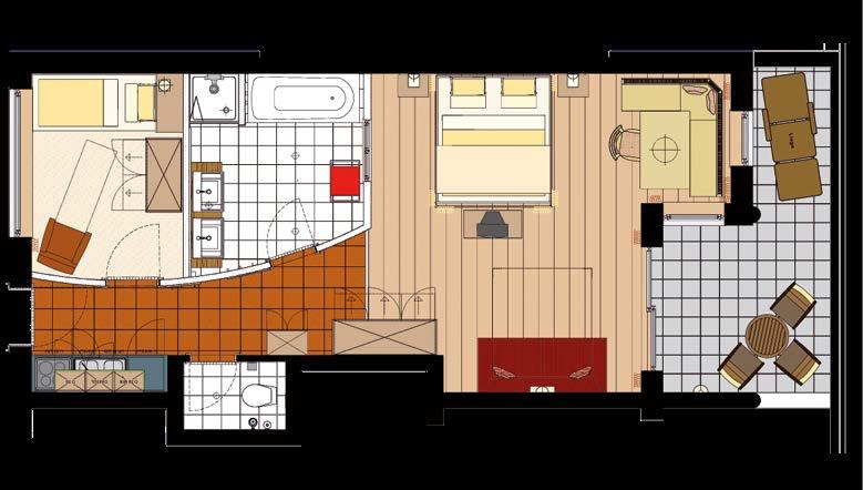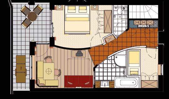 Badezimmer mit Dusche und Badewanne, Saunatücher, Bademantel, Bidet (teilweise), Haarföhn, getrenntes WC (teilweise), Safe, Sat-TV, Telefon, kostenloses Internet mit Kabelverbindung sowie Südbalkon oder Südterrasse, Minibar, Kühlschrank (wird auf Wunsch gefüllt), Lift.