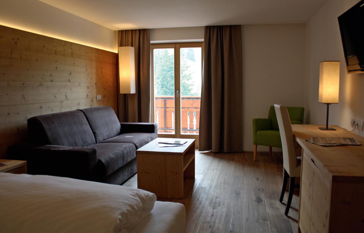 Con la ristrutturazione la maggior parte delle camere sono state ingrandite, inoltre sono state aggiunte delle nuove suite su due piani. Tutte le camere hanno dal balcone una vista panoramica sulle Dolomiti. Sono stati usati materiali ecologici per un arredamento puro. Il delicato profumo di abete, pino e quercia vi accompagnano fino nei vostri sogni.
