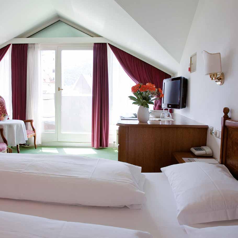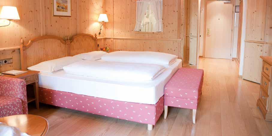 Lasciatevi conquistare dalla magica atmosfera creata su misura per le esigenze dei nostri ospiti! È possibile scegliere tra 13 diverse tipologie di camere, tra le quali ciascuno troverà certamente l’ambiente più adatto alle proprie necessità e aspettative: eleganti camere matrimoniali arredate in stile classico con ampi servizi, ariose e confortevoli camere con grande e comodo letto e accogliente balcone, la romantica Junior Suite con pregiato rivestimento di abete rosso e pino cembro che diffonde il suo profumo in tutto l’ambiente, la suite familiare con due camere separate o ancora l’originale maisonette con due letti matrimoniali…