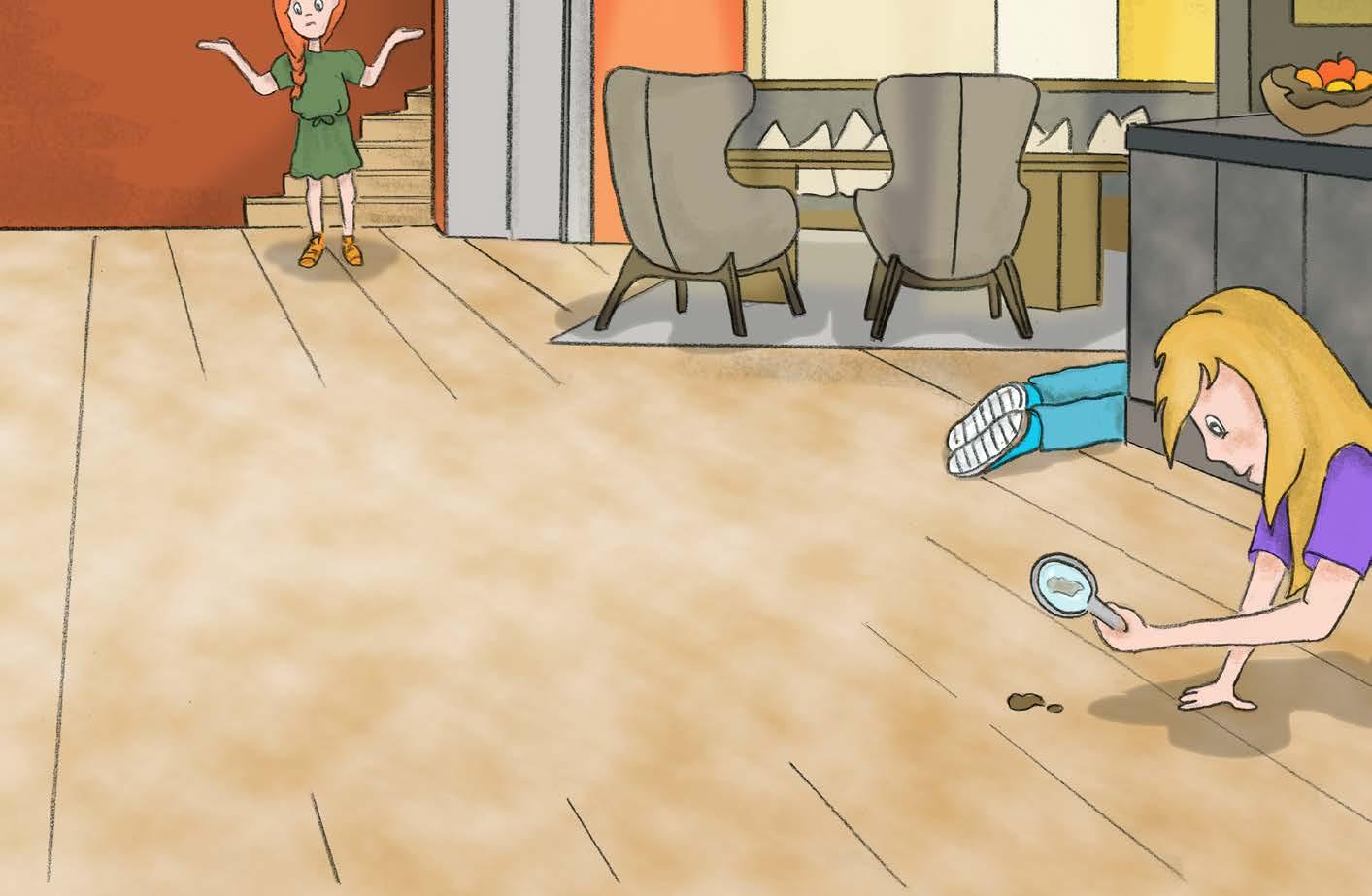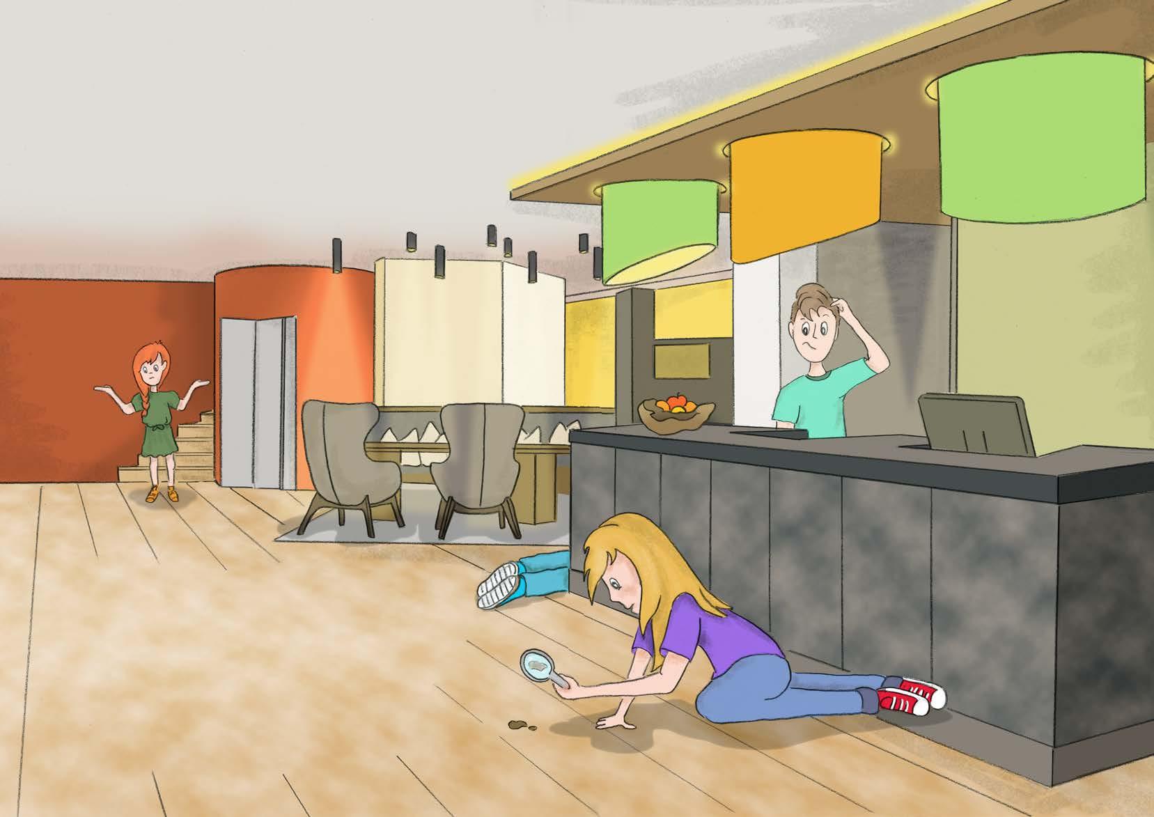 I quattro segugi iniziano subito l’indagine. “Puoi descrivercelo?“, chiede Anna. “Dove lo hai visto l’ultima volta?“, chiede Carolina. Pia singhiozza: “È giallo a pois marroni. Sull’altalena a nido oggi pomeriggio, lo avevo ancora. E anche a cena. Ma adesso è sparito“. “Propongo di perlustrare l’hotel e di distribuire volantini con su scritto «Perso peluche di Pia»“, interviene Fabio.