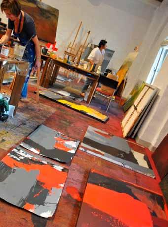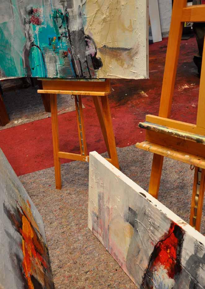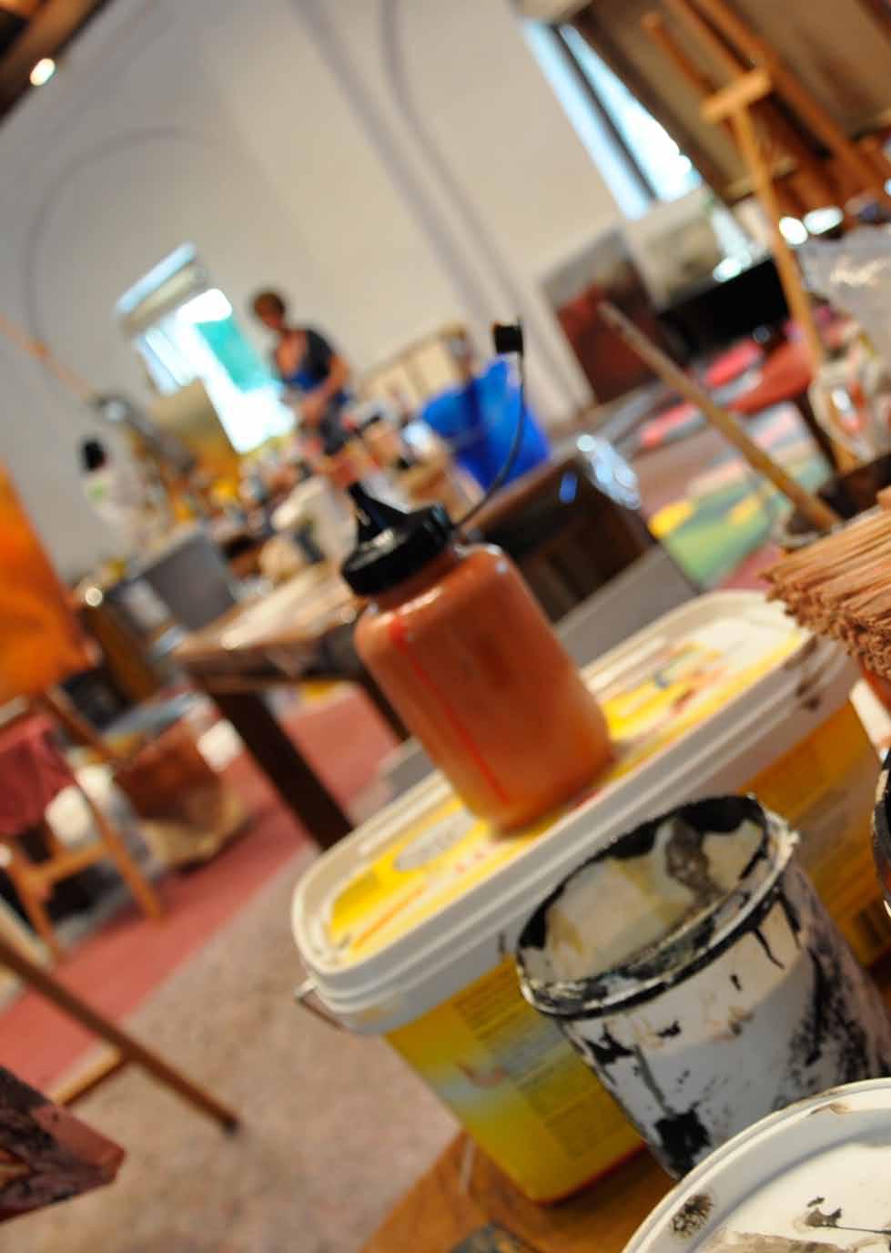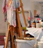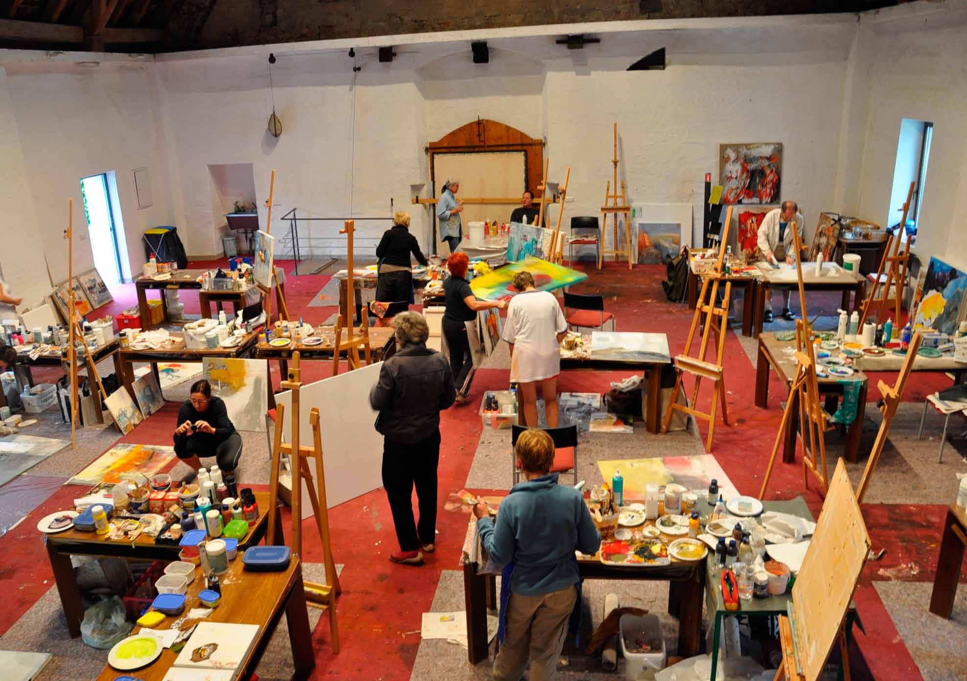 ausstattung: Im Malatelier ist jeder Arbeitsplatz mit einem Tisch, einem Stuhl und Staffeleien ausgestattet. Darüber hinaus stehen den Teilnehmern Klappstühle zur Verfügung, damit auch außerhalb des Ateliers gemalt werden kann.
