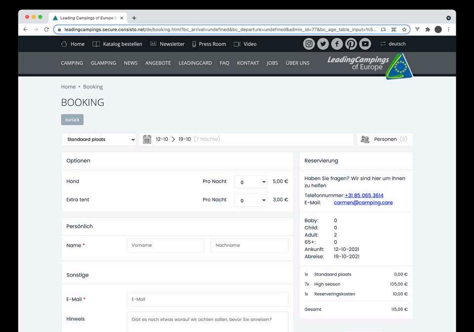 LeadingCampings tilbød online-reservationer for første gang i 2008. Det var en digital pionerindsats. På det tidspunkt skulle alle disponible mængder og priser imidlertid indtastes separat i det interne og det fælles system. Dette tog tid, var en kilde til fejl og kunne i enkelte tilfælde også føre til overraskelser for gæsterne, fordi en plads, der var booket i det ene system, stadig blev vist som ledig i det andet system - det kunne føre til dobbeltbookinger. For at forhindre dette har vi siden arbejdet med et link tilbage til den enkelte campingplads' respektive bookingsystem: ikke flere dobbeltbookinger, ingen mistede gæster, men i bookingoplevelsen forvirrende. Alle, der klikker på "book" via leadingcampings.com, vil fremover blive mødt af et ensartet billede og en ensartet procesbehandling på tværs af koncernen. Det er muligt takket være Camping.