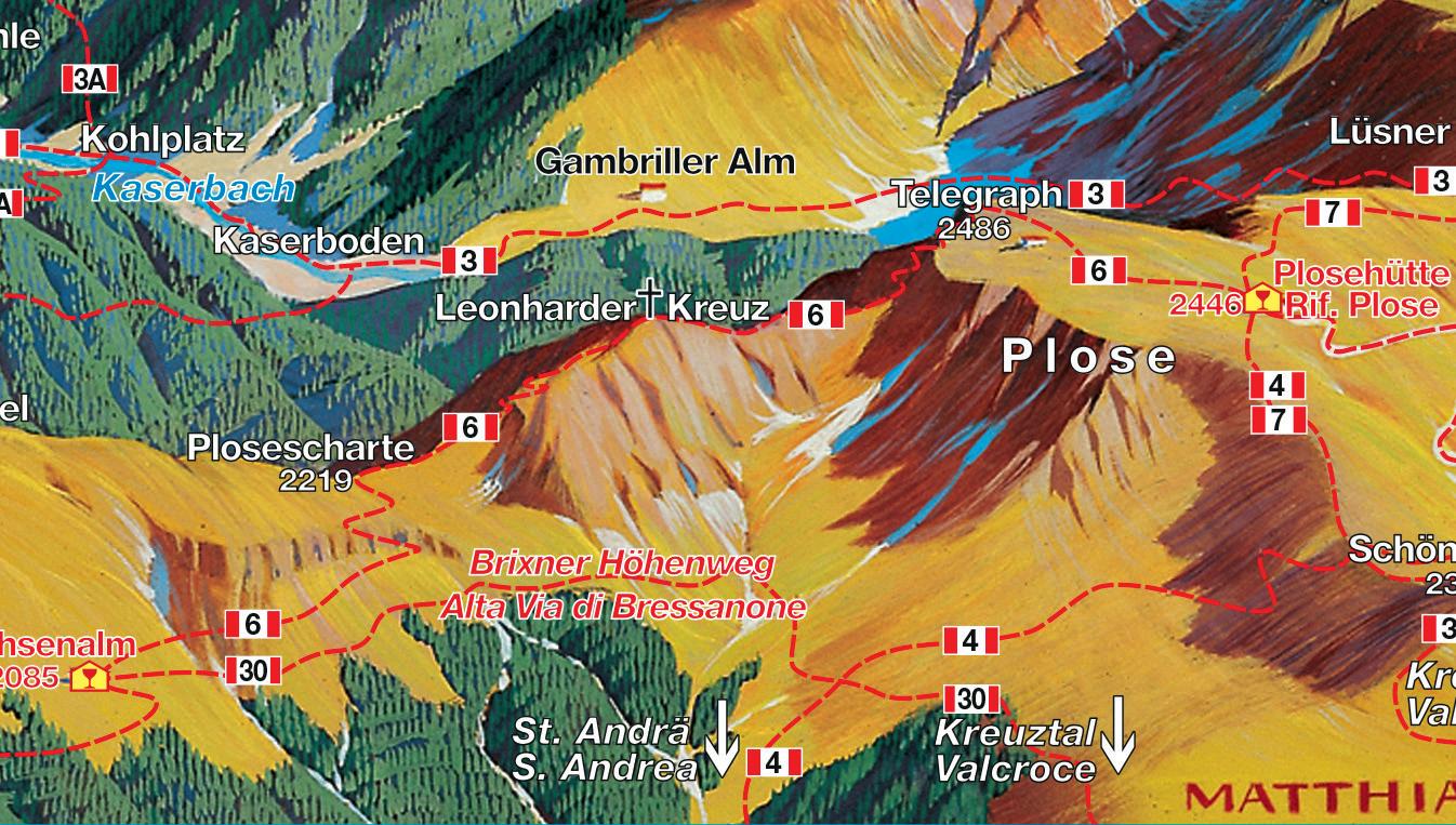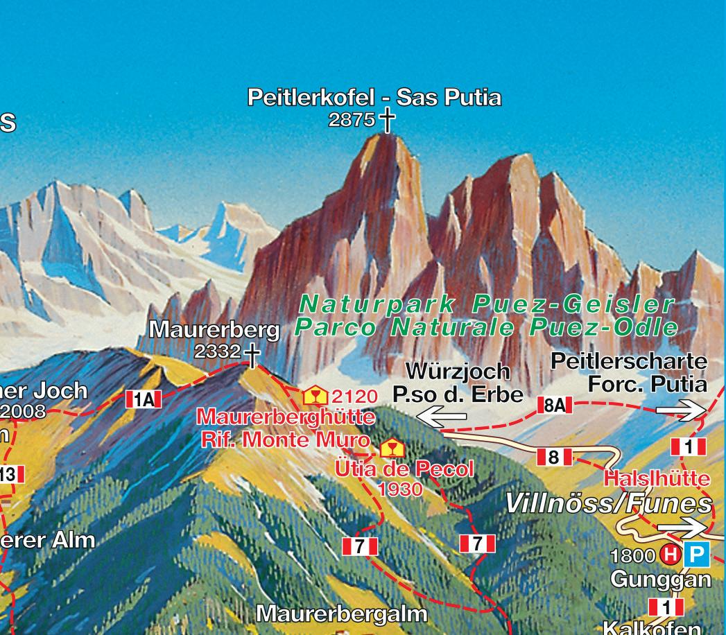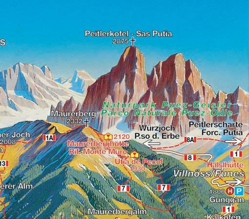 Più impegno fisico richiedono le escursioni alpinistiche e le vie attrezzate, gli itinerari alle cime dell'Alpe di Luson, del gruppo Sasso Putia nel Parco Naturale PuezOdle e sul massiccio della Plose.