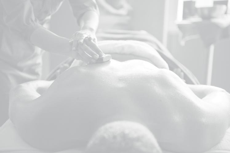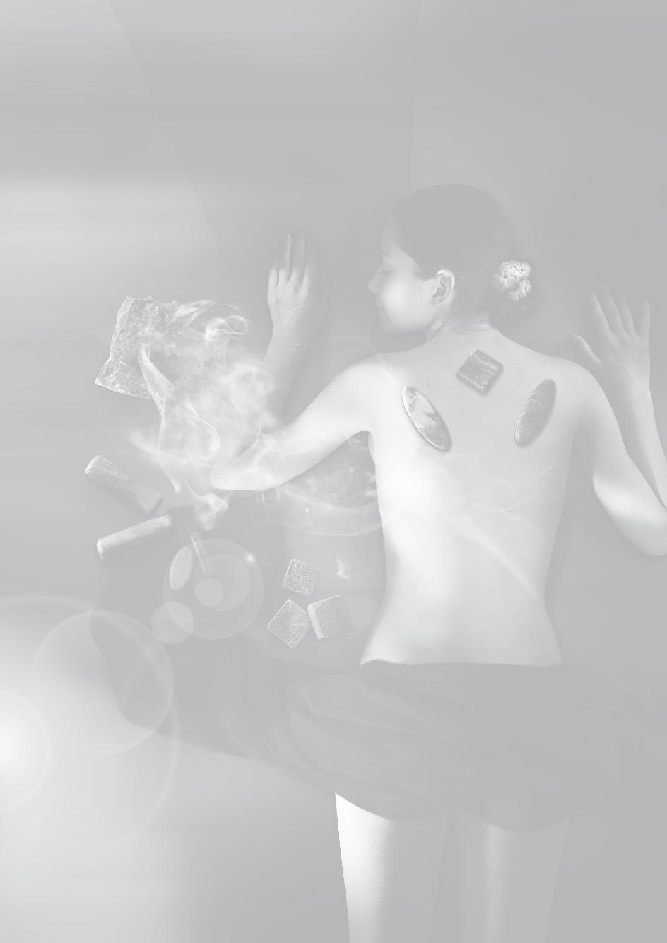 • Trattamento con getti rinfrescanti su viso e braccia in vasca di pietra rilassante massaggio all’olio di ginepro • Stimolazione del centro di pressione per l’attivazione delle energie solari base di resina di larice per rinforzare