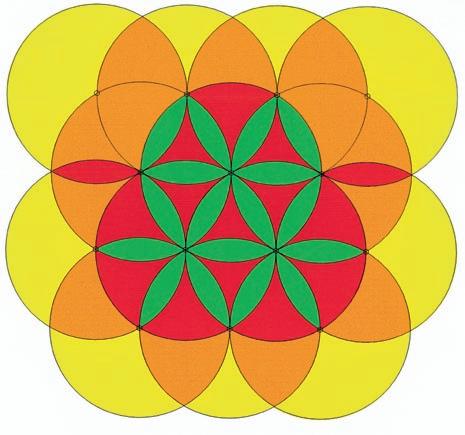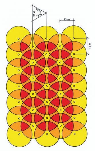 In diesem Beispiel werden die verringerten Deckungsbeiträge hervorgehoben, wenn die Regnerwurfweite nicht 15 m im gleichseitigen Dreieck mit der Seitenlänge von 15m beträgt, sonder nur 12,5 m. Die Farbe grün mit vierfacher Überlappung der Benetzungskreise fehlt hier vollkommen. Auch die Felder mit zwei- und dreifacher Überlappung und den Farben rot, sowie orange, sind wesentlich kleiner geworden. Gelb, mit einfacher Benetzung, hat sowohl im nahen Regnerumfeld, als auch im Außenbereich des Beregnungsareals zugenommen. Fazit: Sowohl mit den veränderten Regnerabständen, als auch den Regnerwurfweiten (= Radius der Benetzungskreise) ergeben sehr unterschiedliche Überdeckungsbeiträge im Regnerverband. Der mehrfache Deckungsbeitrag bedeutet höhere Qualität der Wasserverteilung jedoch nicht die drei oder vierfache Niederschlagsmenge. Achtung! Die Deckungsbeiträge der Benetzung von den Kreisflächen einzelner Regner im Regnerverband ist nicht gleichbedeutend mit der gleichmäßigen Wasserverteilung über die beregnete Fläche. Diese muss gemessen, oder rechnerisch ermittelt werden.