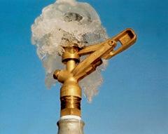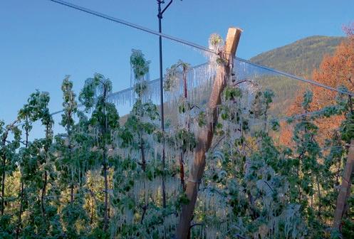 Südtirol hat im Obstbau europaweit am meisten Frostschutzberegnungsanlagen in Betrieb. Die Ausrüstung dieser Anlagen mit geeigneten Regnern, welche nicht nur im Mehrzweckeinsatz, sondern speziell zur Frostschadenverhütung sich bewähren müssen, ist und bleibt ein stetes Anliegen der Obstbauern, als auch der Anlageninstallateure, sowie Regnerhersteller und Lieferanten. In mehreren Testreihen haben wir zum Beispiel in 12 Nächten, hauptsächlich im Jänner 1998, 65 Regner vom Handelsangebot auf ihre Funktionstüchtigkeit während Frostnächten geprüft. Die Ergebnisse haben sich überaus aufschlussreich gezeigt (siehe Foto).