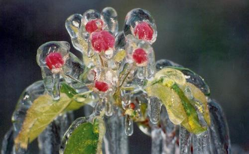 Alle Pflanzenteile, die nach oben zum klaren, freien Firmament exponiert sind, können durch die Wärmeab- oder Wärmeausstrahlung zusätzlich gefährdet sein. Solange fortlaufend Wasser zu Eis erstarrt, und die sogenannte „Erstarrungswärme“ freigesetzt wird, sinkt in der unmittelbaren Umgebung des Gefriervorganges die Temperatur auf rund -0,5°C ab und verharrt auf diesem Wert, ganz unabhängig, ob nun die Umgebungsluft auf etwa -6°C, oder noch etwas tiefer absinkt. Da Eis ein guter Wärmeleiter ist, kann auch der dickste Eispanzer,