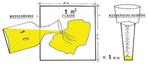 Ein (1) Liter Wasser, verteilt auf ein (1) Quadratmeter Fläche, ergibt ein (1) Millimeter Niederschlagshöhe (siehe Schaubilder oben).