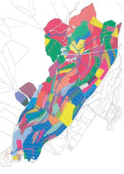 Beispiel der Parzellenstruktur, die typisch für ein Großteil der landwirtschaftlichen Nutzfläche in Südtirol ist. Durch diese Fragmentierung der Anbauflächen nach Basitztum und Anbausystemen mit völlig unterschiedlicher Pflege, machen eine rationelle Bewirtschaftung sehr schwierig und vor allem kostspielig. Die Zusammenlegung dieser klein strukturierten Grundstücke in größeren und gemeinschaftlich geführten Betriebseinheiten, könnte viele Probleme effizient lösen, die früher oder später sowieso zu bewältigen sind, wenn man den landwirtschaftlichen Grund weiterhin nutzbringend bewirtschaften will.