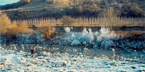 dern erreicht fast alle Höhen der Seitenhänge gleichermaßen. Wenn aber jedes mal bei verstärktem Aufkommen von Windböen die Temperatur über 0°C ansteigt, weiß man, dass es sich um einen periodisch wiederkehrenden Strahlungsfrost handelt, der durch den Windeinfluss eigentlich unterbrochen wird, weil der Wind Plusgrade mit sich führt. Diese Art Frostgefahr, welche abwechslungsweise mit Frost ohne Wind, oder mit Wind ohne Frosttemperaturen auftritt, wird im Südtiroler Obstanbaugebiet am häufigsten vor dem Einschaltzeitpunkt der Frostschutzberegnung zu verzeichnen sein. Der Wind stammt dabei nicht