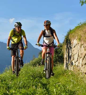 Kurzum: eine Fülle unwiderstehlicher Anreize, die es für Sie beim Mountain-Biken in Partschins, Naturns und Kastelbell, von der Talsohle bis hoch hinauf zu entdecken gibt. Unendliche MountainbikeStrecken auf den Spuren der Transalp auf den beiden Tal-seiten der Region mit Blick auf unvergessliche Panoramen von malerischen Almen und Berggasthöfen sind garantiert. Und echte Südtiroler Gastlichkeit gibt’s extra da-zu! Geführte MTB-Touren und Techniktrainings mit professionellen Guides, Dienst- und Serviceleistungen (Fahrradshops-/verleihe, Bike-Shuttles, Fahrradwerkstätten), die es für Ihren gelungenen Aktivurlaub braucht, runden das Bike-Angebot ab. Ebenso gibt es für weniger trainierte „Radler“ die Möglichkeit, E-Bikes auszuleihen und damit in eine unverwechselbare Naturkulisse durchzustarten.