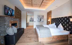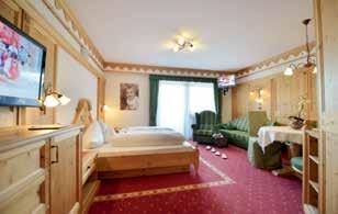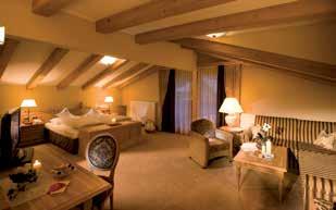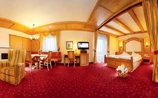 Letto a baldacchino, divano con 2 poltrone, stufa contadina, minibar, cassaforte, TV-LCD, radio, telefono, WiFi, scrivania e terrazza. Grande bagno (ca. 20 m2) con TV e soffitto stellato. Piccola SPA interna: vasca idromassaggio per due persone, cabina a raggi infrarossi per due persone. Doppio lavabo, specchio cosmetico, bidet, asciugacapelli, WC, doccia, termoarredo scaldasalviette, WC di servizio separato.