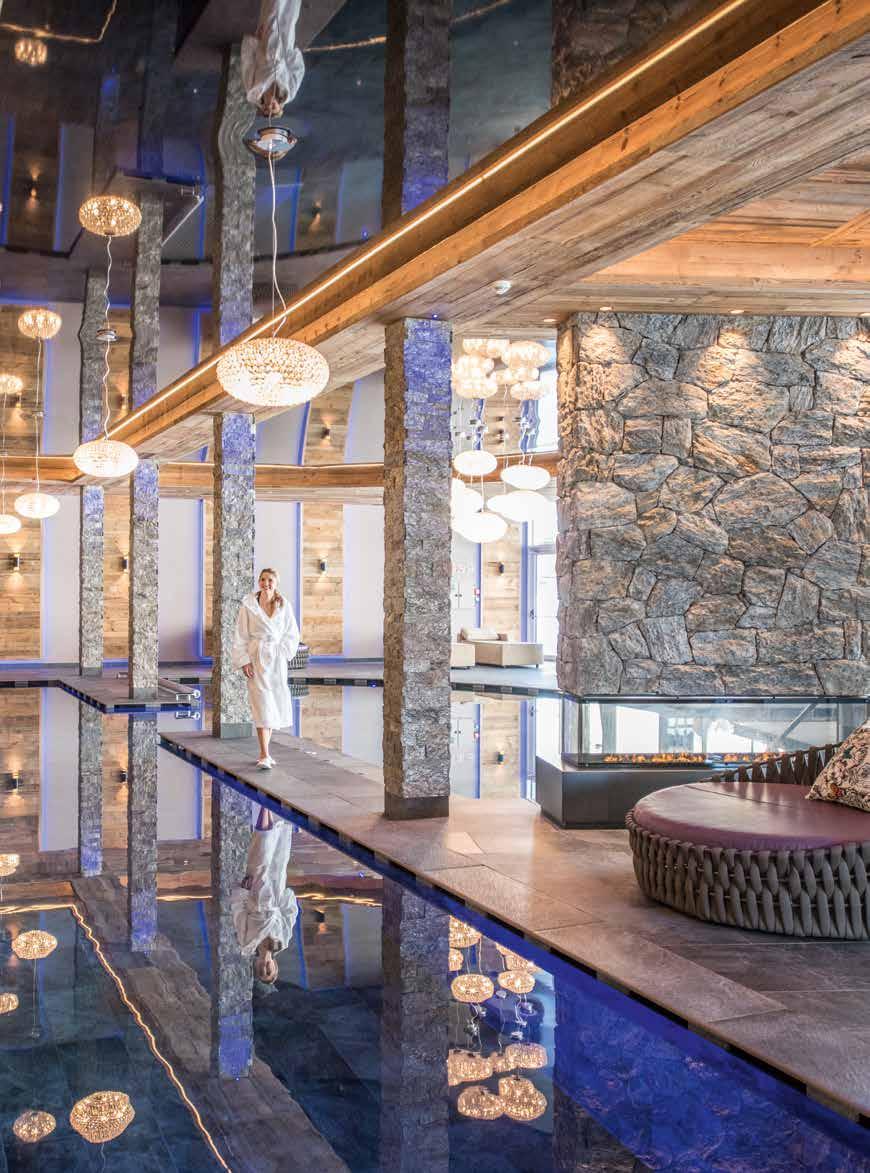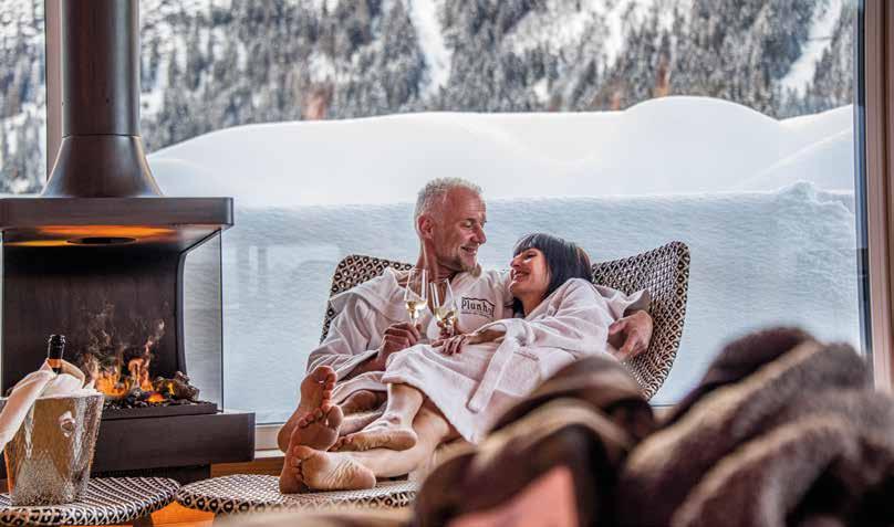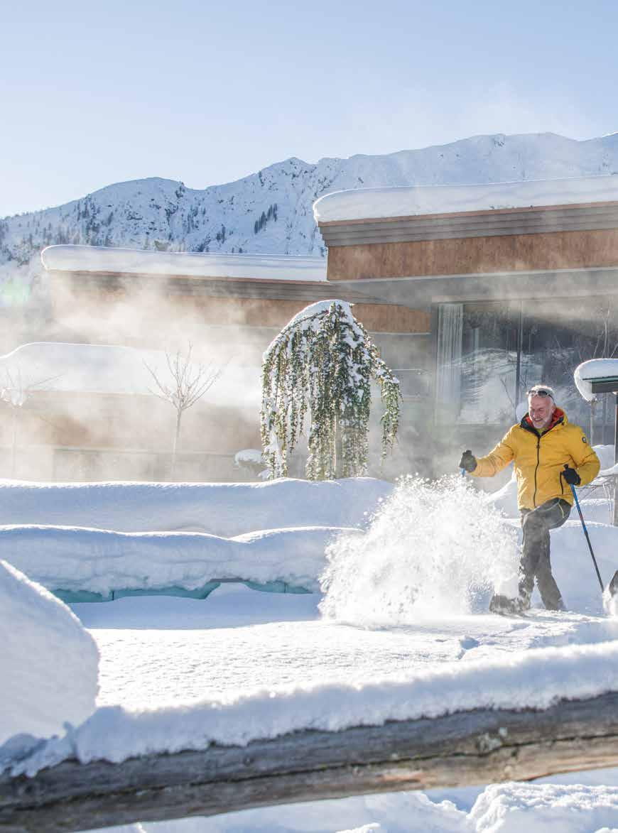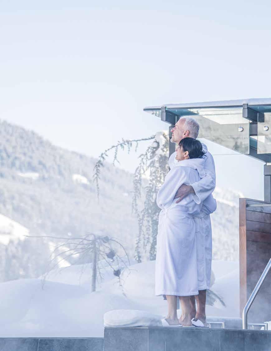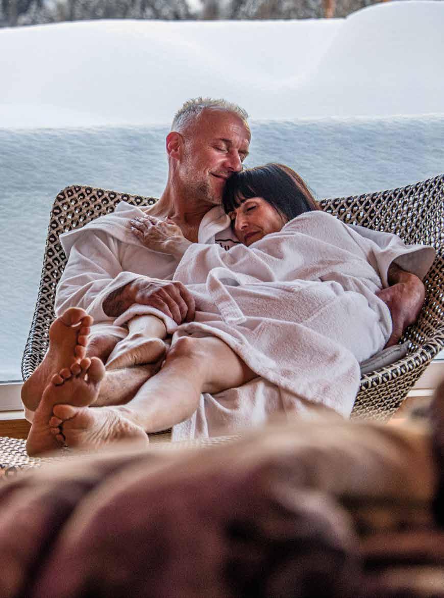I fiocchi di neve cadono dolcemente dal cielo e noi ci rilassiamo nei nostri morbidi accappatoi. È un modo meraviglioso per staccare la spina. Improvvisamente una sensazione mi assale: perché non scopriamo i sentieri coperti di neve intorno all’hotel nel pomeriggio?