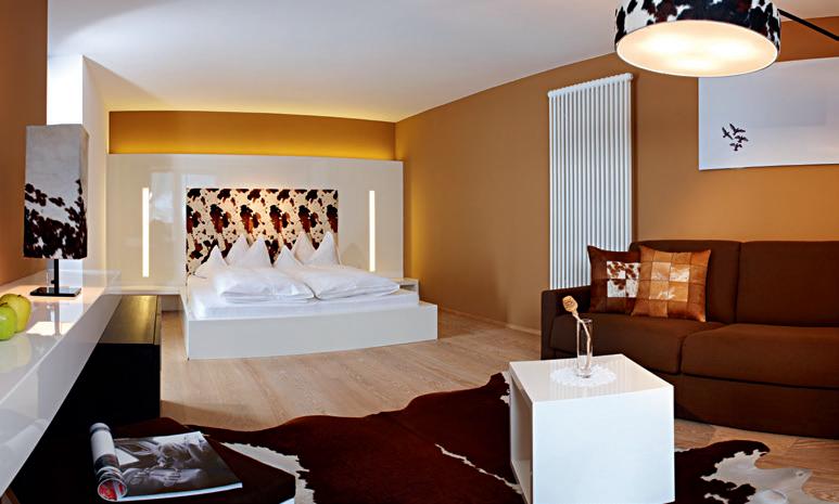 Luxuriöse Ausstattung mit 50 m , Wohnbereich & Schlafzimmer, offen gestalteter Badebereich mit Freistehwanne & Ruhebett, Ausstattung in einheimischer Lärche, mit Lärchen-Naturholz- Boden, Schiebetürschrank, Garderobe, Kofferbock, Minibar, Zimmersafe, Telefon, Internetanschluss, ausziehbares Schlafsofa (160 x 200 cm), als Stube gestaltete kleine Sitzecke, offener Kamin mit Dekorfeuer, Badezimmer mit 1 Waschtisch, Dusche mit großer Tellerkopfbrause, getrenntes Tages-WC mit Bidet, Plasma TV-Gerät, großer Balkon (15 m²) mit herrlichem Ausblick auf die Landschaft.