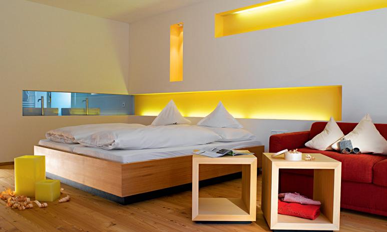 Schlafzimmer mit 35 m in Lärche dunkel gebeizt, barrierefrei, Lärchenboden, Schreibtisch, Minibar, Zimmersafe, Telefon, Internetanschluss, Schminkspiegel, ausziehbares Schlafsofa (160 x 200 cm), Plasma TV-Gerät, großer Balkon (12 m²) mit Blick auf den Helm, exklusive KomfortLiegen. Auch als Einzelzimmer barrierefrei verfügbar.