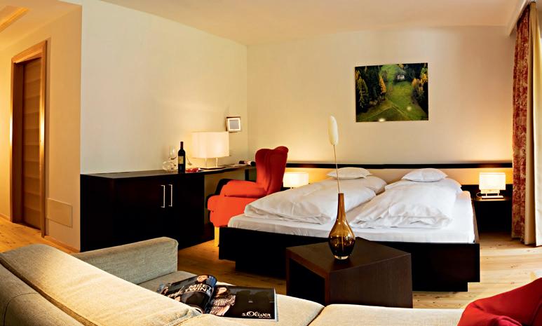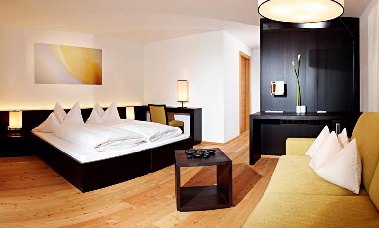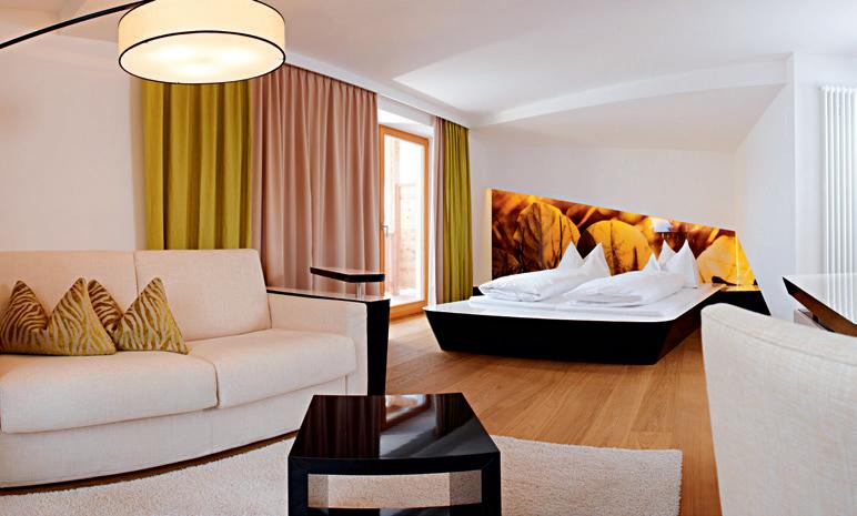 40 m2 in Lärche natur, Lärchenboden, Himmelbett, Schiebetürschrank, Garderobe, Kofferbock, Schreibtisch ausgebildet als Sekrektär, Minibar, Zimmersafe, Telefon, Internetanschluss, Schminkspiegel, ausziehbares Schlafsofa (160 x 200 cm), Badezimmer mit 2 Waschtischen, Badewanne mit Duschmöglichkeit, getrenntes Tages-WC mit Bidet, Plasma TV-Gerät 360° schwenkbar, großer Balkon zur Südseite (10 m²).