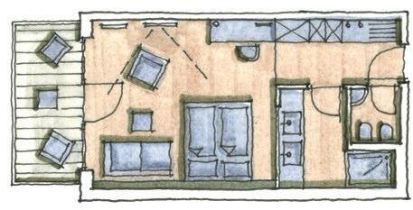 Schlafzimmer mit 37 m2, in Wengé, Lärchenboden, großer Schiebetürschrank, Schreibtisch, Garderobe, Kofferbock, Minibar, Zimmersafe, Telefon, Internetanschluss, Schminkspiegel, ausziehbares Schlafsofa (160 x 200 cm), Badezimmer mit 2 Waschtischen, Badewanne, getrenntes Tages- WC mit Bidet & Waschbecken, Plasma TV-Gerät, große Terrasse zur Südseite (20 m²), exklusive Komfort-Liegen.