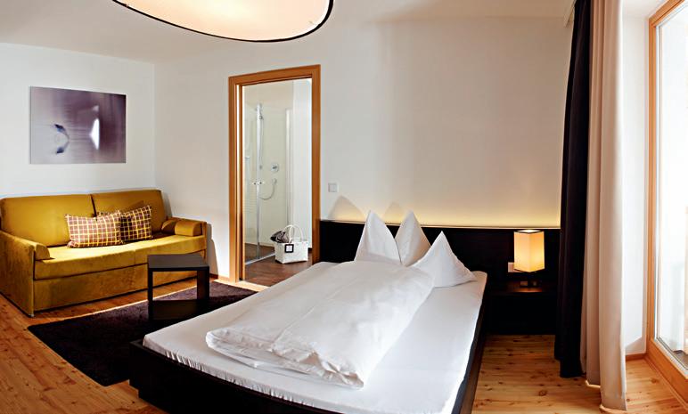 Schlafzimmer mit 20 - 27 m2 in Lärche natur, Lärchenboden, französisches Ehebett (150 x 200 cm), Minibar, Zimmersafe, Telefon, Internetanschluss, ausziehbares Schlafsofa (160 x 200 cm), Dusche, WC, teilweise mit Bidet, Plasma TV-Gerät, je nach Lage mit großem Balkon (12 m2), mit französischem Balkon, mit Blick auf den Garten oder auf den Helm. Auch als Einzelzimmer barrierefrei verfügbar.