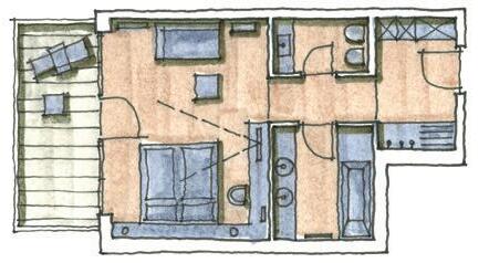 Schlafzimmer mit 35 m2, Zirbelholz in Kombination mit Lärche dunkel gebeizt, Schrank, Garderobe, Kofferbock, Schreibtisch, Minibar, Zimmersafe, Telefon, Internetanschluss, Schminkspiegel, ausziehbares Schlafsofa (160 x 200 cm), 2 Waschtische, Dusche mit quadratischer Tellerkopfbrause, WC mit Bidet, Plasma TV-Gerät, MonikaZirbenkissen, Balkon (5 m2) mit garantiert dem schönsten Ausblick auf die Sextner Sonnenuhr.