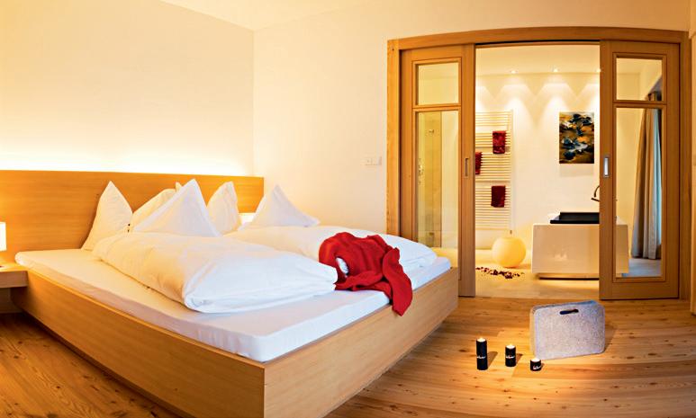 Luxuriöse Ausstattung mit 50 m2, Wohnbereich & Schlafzimmer, offen gestalteter Badebereich mit Freistehwanne & Ruhebett, Ausstattung in einheimischer Lärche, mit Lärchen-Naturholz- Boden, Schiebetürschrank, Garderobe, Kofferbock, Minibar, Zimmersafe, Telefon, Internetanschluss, ausziehbares Schlafsofa (160 x 200 cm), als Stube gestaltete kleine Sitzecke, offener Kamin mit Dekorfeuer, Badezimmer mit 1 Waschtisch, Dusche mit großer Tellerkopfbrause, getrenntes Tages-WC mit Bidet, Plasma TV-Gerät, großer Balkon (15 m²) mit herrlichem Ausblick auf die Landschaft.