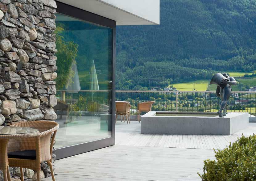 Entspannende Saunen, wohltuende Massagen, Eintauchen in das belebte Wasser des 32°C Freibades oder in das 32°C Innenbecken aus Südtiroler Silberquarzit, aufbauende