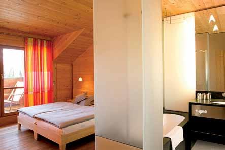 Unkonventionell designte Mansardenräume ganz in Holz, ab 37 m², mit Schlafzimmer und Wohnraum, Glasbadezimmer mit Badewanne/Dusche, Bidet. Minibar mit Mineralwasser und Bergwasser. Badetasche mit Bademantel und Badeschuhen. SAT-TV, Safe, Telefon, Internet-Anschluss.