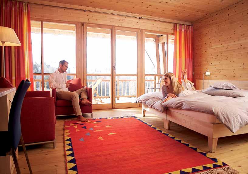 We would like to invite you on a journey through a special living landscape. You will find a place to dream and relax in our unique rooms and suites. The walls are made from wood and glass, the floors from wood or natural stone and the carpets are hand-woven. The walls, ceilings and floors in the rooms and suites are made from unprocessed spruce and larch wood which has been felled in tune with the phases of the mood, making it particularly resistant.