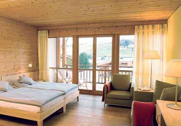 Comfortably designed individual rooms all in wood, from 44 m², with bathroom, bath tub/ shower and bidet. Balcony with garden views. Mini-bar with mineral water and mountain water. Bathing bag with dressing gown and bathing slippers. Satellite TV, safe, telephone and internet connection.
