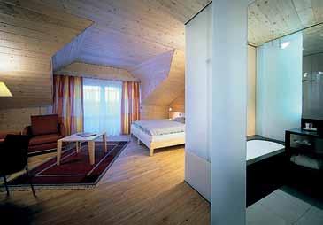 Unconventionally designed attic room all in wood, from 37 m², with bedroom and living room, glass bathroom with bath tub/ shower and bidet. Mini-bar with mineral water and mountain water. Bathing bag with dressing gown and bathing slippers. Satellite TV, safe, telephone and internet connection.