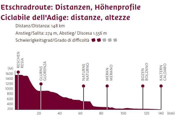 Etschradroute an der Via Claudia Augusta Kulturerlebnis zwischen Gärten und Architektur. Die Etschradroute schlängelt sich durch die abwechslungsreiche Kulturlandschaft des Etschtals vom Reschen durch den Vinschgau, das Burggrafenamt und das Überetsch, vorbei an Meran und Bozen bis nach Kaltern. Die Touren durch die weite, ebene Talsohle sind ideal für Genussradler und Familien. Ambitionierte Radsportler finden dagegen auf Passstraßen und an Berghängen anspruchsvolle Ziele und Routen für Rennrad und Mountainbike.