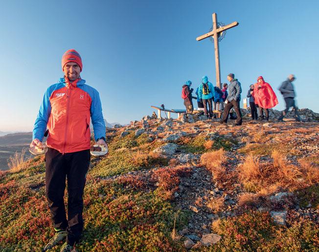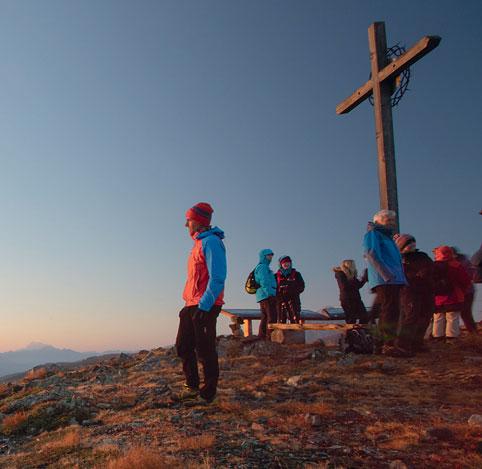 Ein moderater Anstieg, dann rollt sich vor dem Gipfelkreuz des Campill die Bergwelt der Dolomiten aus. Alle warten gespannt auf den Moment, da die Sonne hinterm Kronplatz emporkriecht und ihre ersten Strahlen über die sanft aufbuckelnde Lüsner Alm jagt.