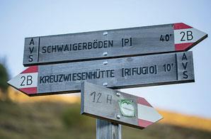 verlässt den Gipfel, folgt der Almstraße kurz nach rechts, biegt als Weg 10 nach links und fällt als Pfad über Weidewiesen und ein kleines Moor abwärts. Hinter dem Steg auf dem Almweg kurz nach rechts biegen, bis sofort Weg 12 A links hinab an der Burger Wiese-Alm vorüber und über die Almstraße als Weg 2 B bis zur Kreuzwiesenalm 4 läuft. Auf dem Rückweg mit Weg 2 A Richtung Parkplatz Schwaiger Böden rechts eine Mulde queren und auf dem Schmalzhausstieg bis zum Fahrweg laufen, der nach rechts hinab zum Ausgangspunkt führt. Als Alternative für Wanderer, die mit dem Bus heraufkamen, bietet sich ab der Kreuzwiesenhütte Weg 12 als Abstieg über alte Heuziehwege nach Lüsen an (1 h 40 min).