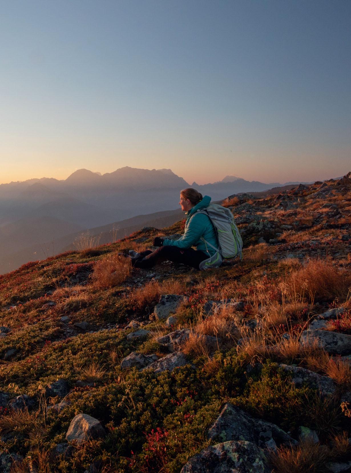 Wenn überm Kronplatz die Sonne aufgeht: Auf dem Campill begrüßt wanderlustAutorin Beate Wand den neuen Tag. Er buckelt sich auf der Lüsner Alm, nach der Seiser Alm die zweitgrößte Hochalm Südtirols.