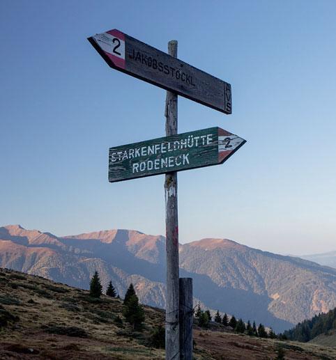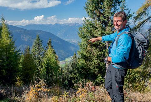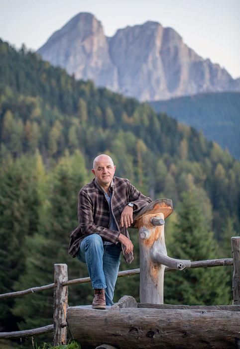 Wieder auf dem Weg, kurven wir den Hang hinauf. Die Steigung erlaubt noch zügiges Tempo, ohne zu keuchen. Bloß nicht zu spät kommen! Als Franz früher auf der Alm seines Großvaters mithalf, fiel auf, wie gut er mit den Gästen umgehen konnte. So fügte es sich durch ein paar glückliche Umstände, dass er schon mit 21 Jahren ein Hotel eröffnete. Seine Schwester schmiss Küche und Zimmer, Franz den Rest. Der Betrieb wächst, spezialisiert sich auf Natur und Wandern, wird zum besten Wanderhotel Europas gekürt. „Wir waren Mitte der 1990er die ersten, die fast täglich geführte Schneeschuhwanderungen mit unseren Gästen gemacht haben“, erzählt der Hotelier nicht ohne Stolz. „Da haben uns alle anderen den Vogel gezeigt.“ Die lawinensichere Lüsner Alm bietet ideale Voraussetzungen für sanfte Wintersportarten. Im Sommer nehmen Franz und sein Team die Gäste täglich mit auf zwei Wanderungen: einmal die sanfte Tour mit Waldbaden oder Kräuterkunde, einmal etwas anspruchsvoller zu umliegenden Gipfeln.