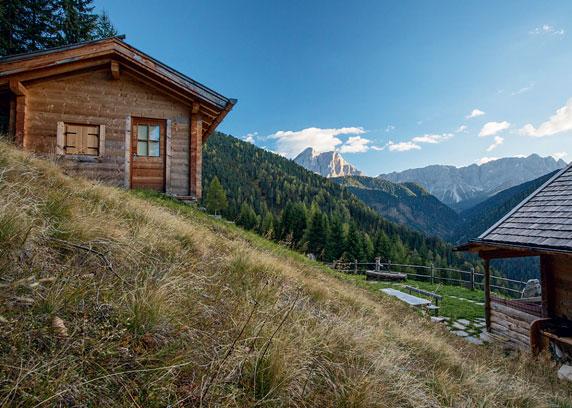 Der Trick, die alte, sonnenverbrannte Fassade mit all ihren eingeritzten Inschriften einfach zu umbauen und als Innenwand wirken zu lassen, begegnet mir erneut auf der Maurerbergalm. Franz Hinteregger gestaltete sie komplett um. Samstags wandert er mit seinen Gästen zu dem abgelegenen Fleckchen. „In der Pfanne hier rüttle ich meine Leibspeise. Schwarze Polenta“, verrät er, neben einer der Hütten stehend, „aus Buchweizenmehl, mit Butterschmalz und Mohn drauf.“ Er unternimmt lieber etwas mit den Gästen, anstatt sie abends an den Tischen zu umgarnen. Weckt sie mit morgendlichem Qi Gong, spielt auf dem Akkordeon, schenkt beim Lagerfeuer ein Schnapserl ein. Der Tausendsassa wagt sich in Nischen vor: Beim Ritual in der von ihm ersonnenen, äußerst komfortablen Schwitzhütte reicht Franz die heißen Steine auf der Schaufel herein. Sehnsucht nach der Alm trieb ihn zum jüngst vollendeten Projekt. Seine Gäste können die Alm auch einen Tag für sich allein buchen. Er genießt die Freiheit oben. „Hier ist so ein geborgener Ort“, schwärmt er, „wenn du hier ganz allein Sauna machst, danach hier draußen sitzt. Das gibt es nirgendwo.“ Und dann bringt die Abendsonne auch noch den Peitlerkofel mit den letzten Strahlen des Tages zum Glühen.