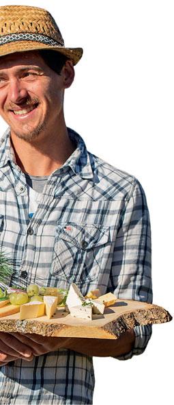 Produkte landen direkt hier oben auf Tellern und in Taschen. Das restliche Viertel setzt er über Gastronomie und die Frischwarentheke des Lüsner Bäckers ab. Auf einem rustikalen Holzbrett stellt er uns seine sieben Sorten vor: Frischkäse mit wilden Kräutern der Saison. Unter weißem Flaum ein geschmierter „Woachkas“. Junger