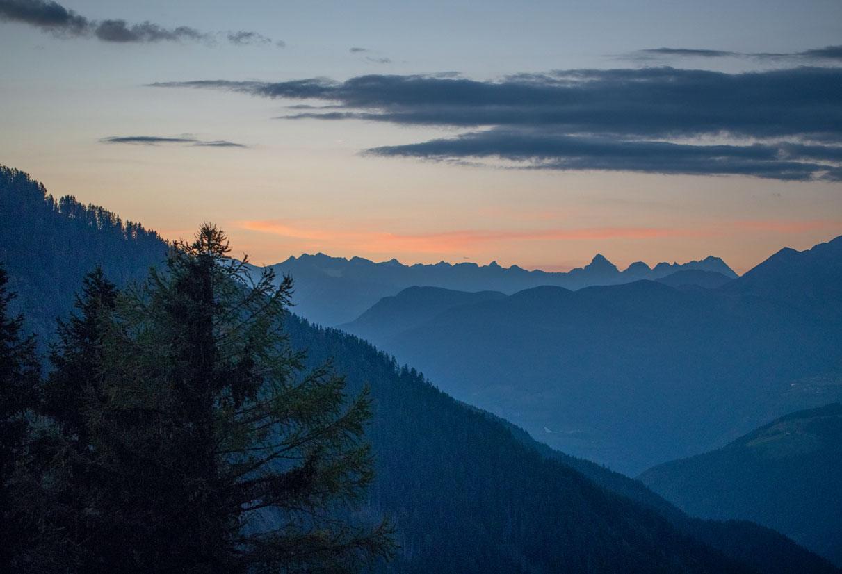 Abendstimmung auf der Maurerbergalm: Hinter Sarntaler und Ötztaler Alpen leuchtet das letzte Licht des Tages.